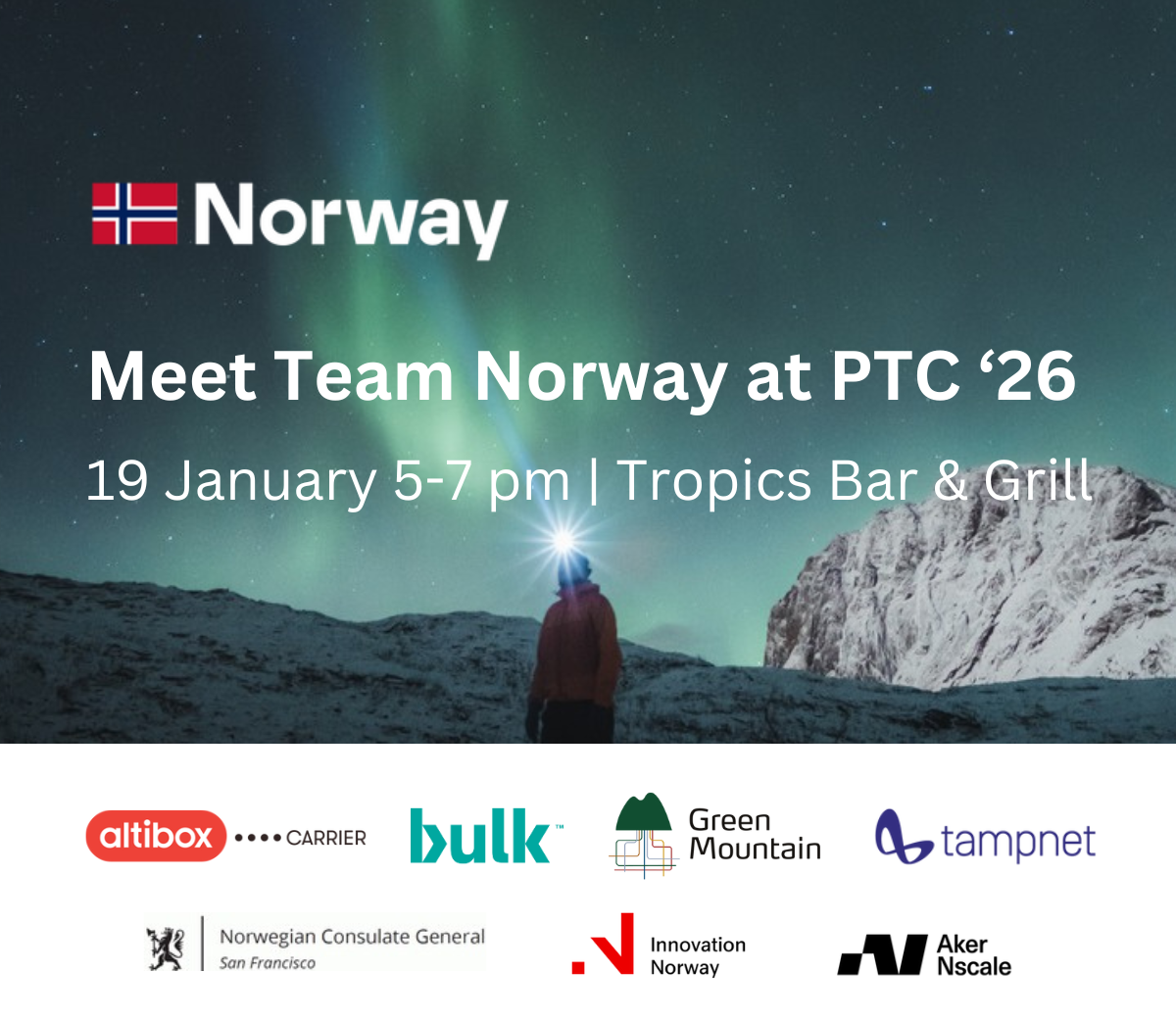 Join our networking event in conjunction with PTC’26, that we will host together with Innovation Norway, Bulk, Tampnet, Green Mountain, Aker Nscale and Norwegian Consulate General San Francisco.